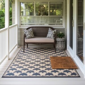 An outdoor rug defines your seating zone and makes everything feel grounded. It visually pulls furniture together and adds texture underfoot.
