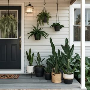 Even two or three budget-friendly plants can transform the vibe. Mix tall planters with small tabletop pots. Add a hanging basket if space allows.