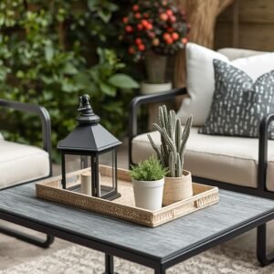 Layering weather-resistant cushions instantly softens metal chairs or wooden benches. Mix textures — canvas, woven fabric, subtle patterns — but keep your color palette controlled.