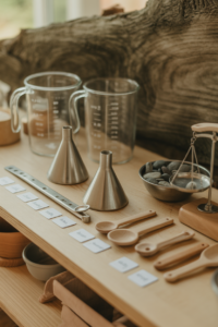 The materials do not need to be specialized or expensive. Standard kitchen measuring cups, a set of metal funnels in different sizes, a few clear plastic or glass jugs so children can see the levels of what they are pouring, and a small balance scale — available quite inexpensively — are all that is needed. The important thing is that these materials are organized, accessible, and displayed in a way that invites interaction. A shelf with each item in a designated spot, perhaps with a simple outline or label beneath, communicates that this is a thoughtful space and these tools have a purpose.