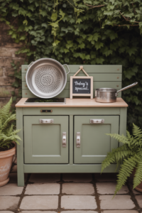 An old kitchen cabinet — the kind with a small countertop and a lower cupboard — can be transformed into an extraordinary mud kitchen with nothing more than a coat of outdoor chalk paint in a color you love, a bit of sanding on the edges to create a distressed, vintage finish, and perhaps some new knobs sourced from a hardware store. The result looks intentional, artful, and genuinely lovely. The lower cupboard becomes a storage space for outdoor play materials. The countertop becomes the stage for hours of culinary creativity.