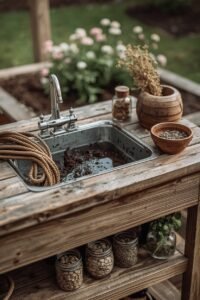 The most effective water-and-mud combo stations incorporate a small sink basin directly into the kitchen structure. A deep metal bowl or an upcycled enamel basin set into a cut-out in the wooden countertop works beautifully. You can run a short length of garden hose from an outdoor tap nearby, or simply keep a large pitcher of water on the lower shelf that children can pour themselves — which, incidentally, is an excellent exercise in pouring control and spatial awareness.