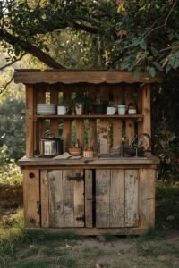 What makes a pallet mud kitchen truly sing is the styling. Do not just nail the pallets together and call it done. Think about proportion: a lower work surface for small hands, a higher shelf for “ingredients” storage, and a hook or two on the side for hanging tools. Old enamelware from thrift stores adds an authentic farmhouse feel. A battered tin watering can repurposed as a utensil holder costs next to nothing and looks like it was styled by a professional. The details are everything.