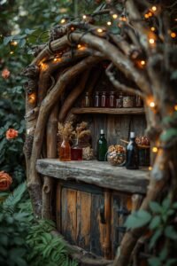 Not every mud kitchen needs to look like a farmhouse fixture. Some children — and if we are being honest, some parents — are drawn to something altogether more enchanted. The fairy-tale mud kitchen leans into the magic that children already naturally bring to outdoor play and turns it up several notches. Think natural curved branches instead of straight lumber. Think small glass bottles filled with colored water displayed on shelves like potions. Think tiny lights woven through the roof structure for the golden hour moment when the garden turns soft and the play turns mythological.