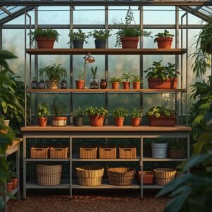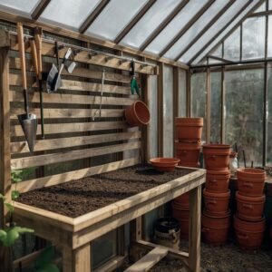 Under-bench space deserves attention too. Most people leave it completely empty or use it as a dumping ground for random supplies. With a few simple shelves or rolling crates, the zone beneath your benches becomes useful storage for pots, tools, bags of compost, and seasonal gear — keeping the surfaces above clear and visually calmer. A tidy greenhouse is a more pleasant greenhouse, and that’s not just an aesthetic observation; it genuinely affects how long you want to stay and work.